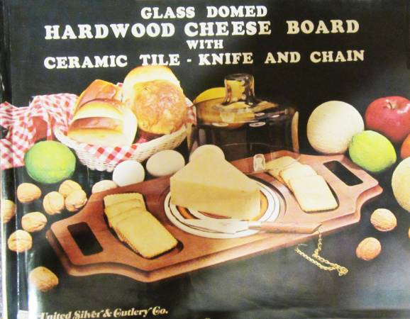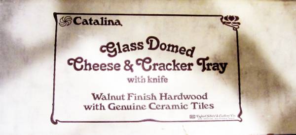 Antigua United Silver and Cutlery Co. Los Angeles Glass Domed Cheese & Cracker Tray with Knife. Walnut Finish Hardwood with Genuine Ceramic Tiles. By United Silver & Cutlery Co. Los Angeles....