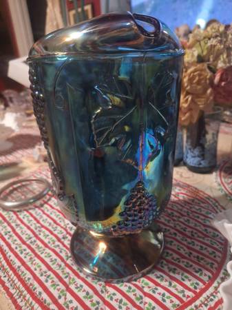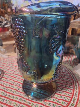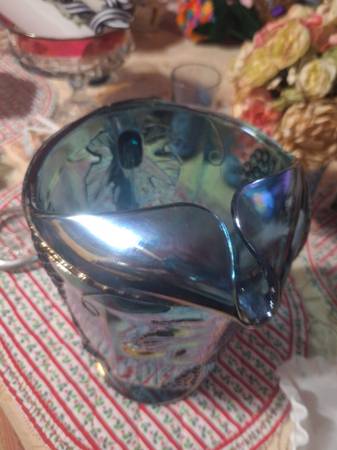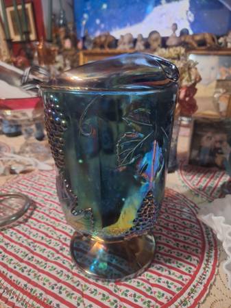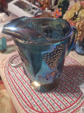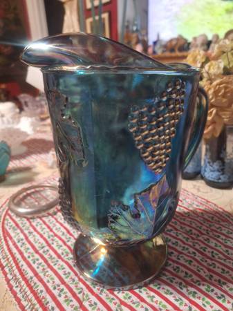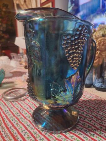 Indiana glass harvest Grape Carnival Glass Iridescent blue pitcher. About 10" tall , 6' diameter, no chips or cracks. ( heavy)