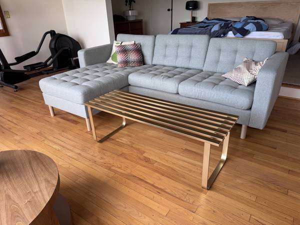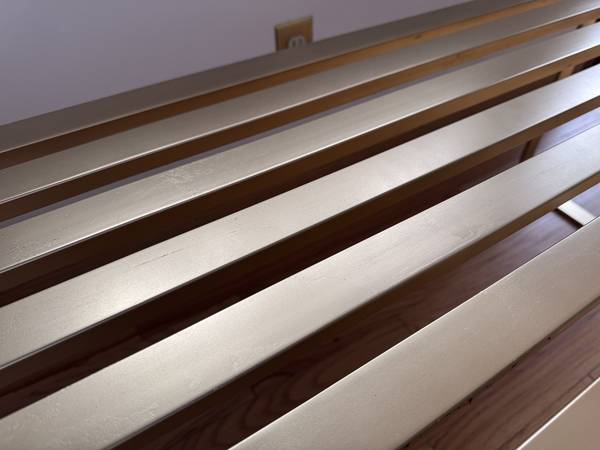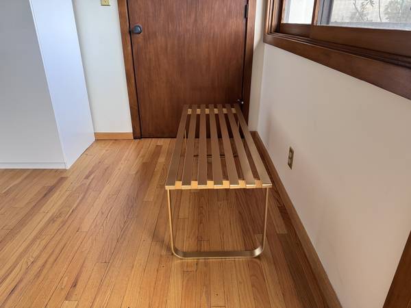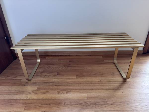 This Mid Century Modern Metal Slat Bench / Coffee Table is a unique and stylish piece of furniture that combines the functionality of a coffee table with the comfort of a bench. The antique design, with a post-1950 time period manufactured, features a modern style and a brass-painted finish that adds a touch of elegance to any living space. The gold color and metal tabletop material make it a standout piece, perfect for adding a vintage touch to a contemporary decor. With its sleek design and versatile use, this bench/coffee table is a functional and aesthetically pleasing addition to any home.