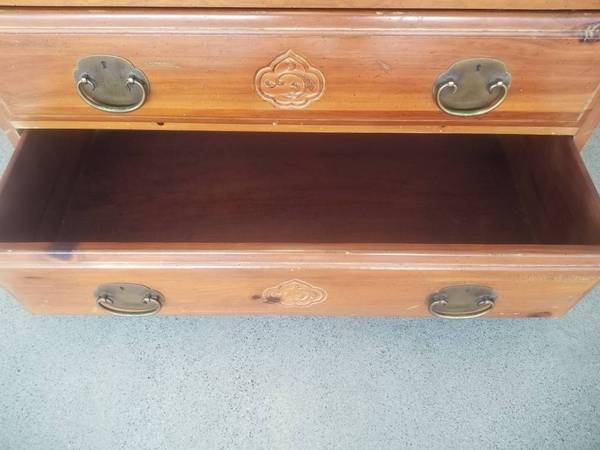 Vintage Henredon footed campaign dresser with 2 drawers, carved Asian motif medallions, 2 drawer fronts with brass campaign hardware corners and metal pulls. Round wood bun feet, patina wood and hardware.