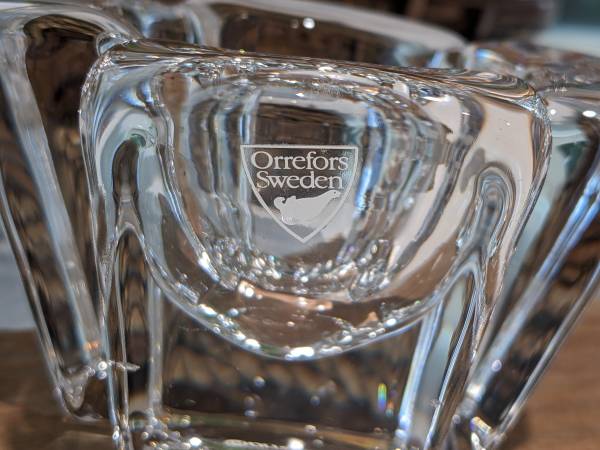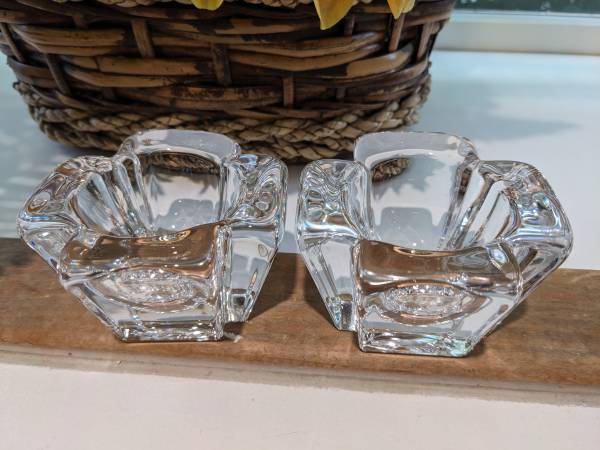 This pair of Orrefors Sweden crystal candle holders is a beautiful addition to any room. The mid-century modern style and abstract theme make it a unique piece of art glass that is suitable for votive, pillar, and taper/dinner candles. The clear crystal material gives it a glossy finish and a weight of 2 lbs 8.4 oz for both.