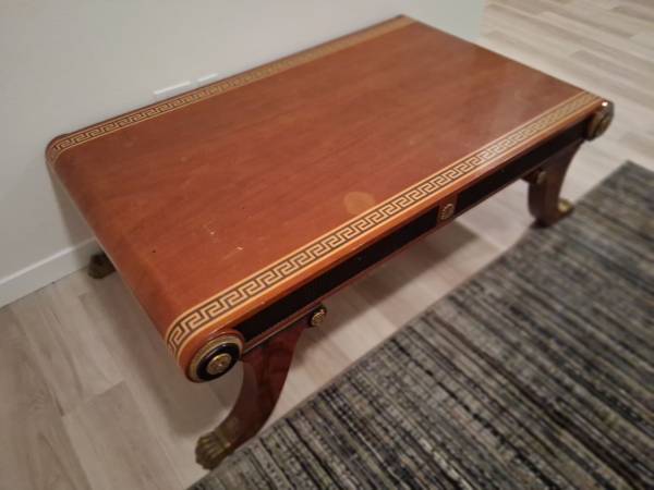 This beautiful table has Greek key border, scroll ends, ormolu mounts and sabre legs that terminate in ormolu lion's paw feet, dating from the last quarter of the 20th century. In the in the Regency Egyptian Revival style with fabulous decorative ormolu mounts.