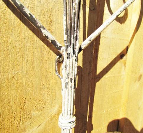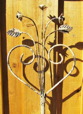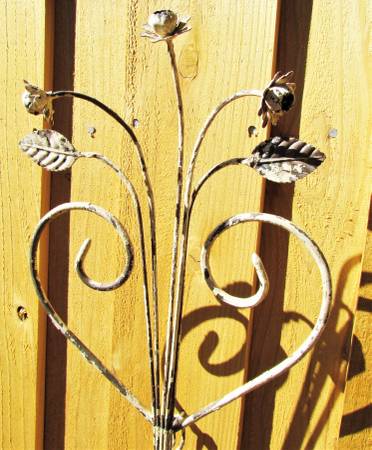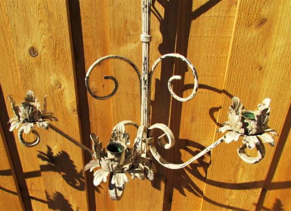 1920s Weathered White French Metal Floral Wall Candelabra Candle Sconce Delicate floral finial top Elegant petal detail on 3 candle holders Beautifully handmade of hammered metal accented with bent...