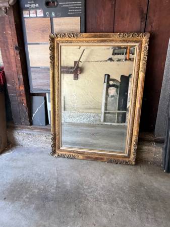 An original early-1900s French Baroque frame, richly detailed and finished in hand-applied 24K genuine gold leaf. Completed with a beveled mirror, this antique masterpiece brings opulence, history, and elegance to any interior. 38” x 41”
