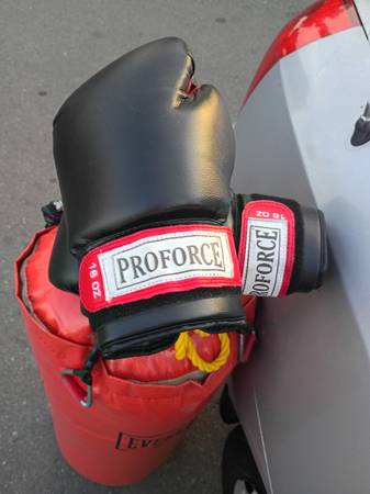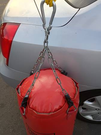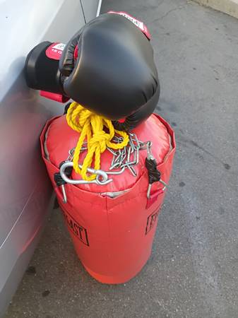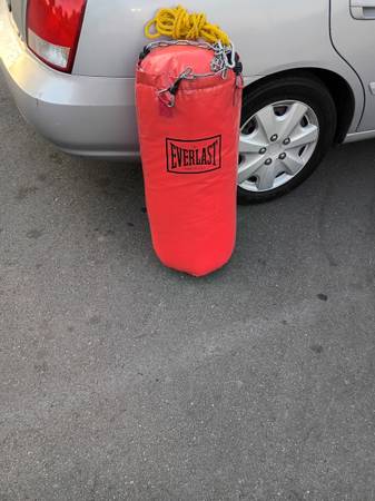 Punching bag ( Everlast) , 50 lbs in excellent condition. Includes boxing gloves 16 ounces. Includes hardware and hanging rope. Combo set for $50.00 Call