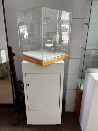 3 Rotating locking jewelry showcase podiums 1 multi shelf locking upright showcase. All have locking storage be beneath. $150 each 500 for all 4 61x19x19 (2) 65x19x 19 78x28x18 Single case