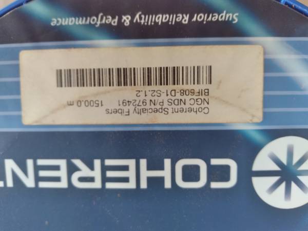 Coherent Specialty Fibers fiber optic cable. 1,500 meters per roll. Approx. 50 rolls available. $45 per roll, quantity discount available if you purchase more than 5 units.