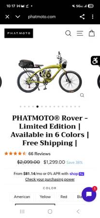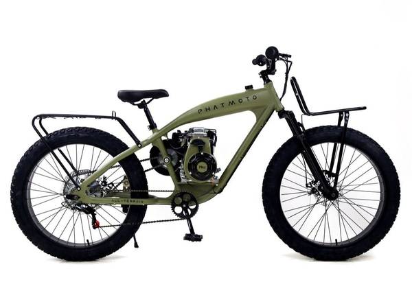 PHATMOTO™ Rover - Limited Edition is the only Motorized Bicycle that integrates both a built-in gas tank and upgraded jackshaft drive train as part of the frame. Powered with a 79cc OHV (Overhead Valve) 4-Stroke engine with centrifugal clutch. Equipped with a well-built frame and double wall 12 gauge spoked wheels and a Front and Back disk brake to handle rough terrains. Off roads? No problem! Now go out and have an epic ride!