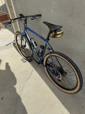 Wilde Rambler, original issue frame (blue sparkled) size L (I'm 6'1). I have the SRAM GX Eagle SRAM AXS shifter wireless system on it. SRAM CenterLine disc brake, Chris King hubs, Limited Edition Brooks/Chris King saddle, Blunt S Wheels, Thomson seat post, Bullmoose handebars, Paul brake levers, Mokoto brakes, Chris King Headset, White Industries crank and bottom bracket, White Industries chainring, Simworks pedals.... All in GREAT, minty, condition (barely ridden at all). Individual parts cost $6,000 last year to put it together, but selling for $3,100 locally. Will go up for sale on the interwebs next week. If it sells in the next two days, I'll include the brand new Garmin Edge 850. Thanks!