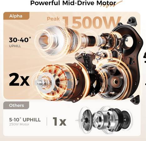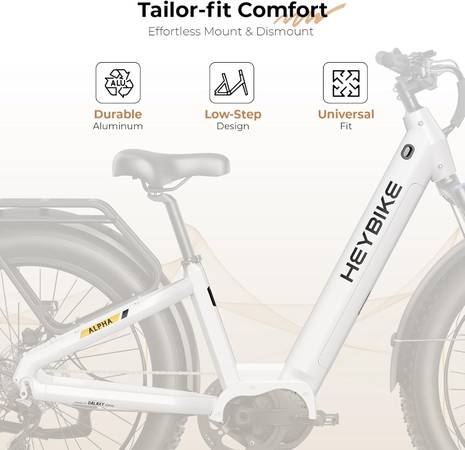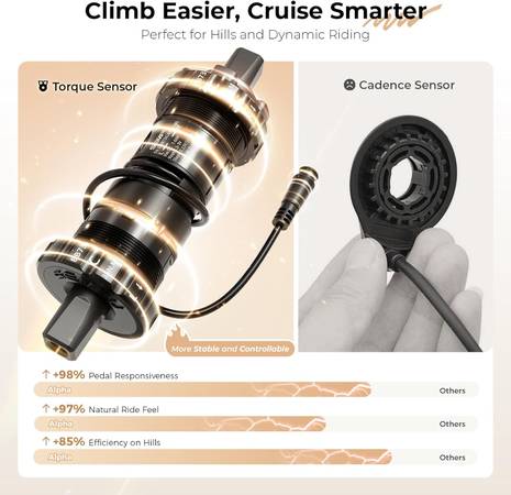 【Unmatched Climbing Power & Control】Heybike Alpha conquers 40° hills and reaches 28MPH with its 1500W mid-drive motor—delivering 3X the torque of hub motors. The precision torque sensor ensures smooth power delivery, while the twist throttle provides instant acceleration—uncommon in mid-drive ebikes.