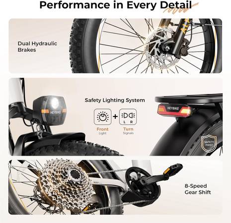 【Pro-Level Safety & Visibility】Equipped with dual hydraulic disc brakes, this fat tire electric bike stops 30% faster than standard bikes. LED turn signals, headlight, and brake lights ensure 360° visibility—perfect for urban streets or off-road rides.