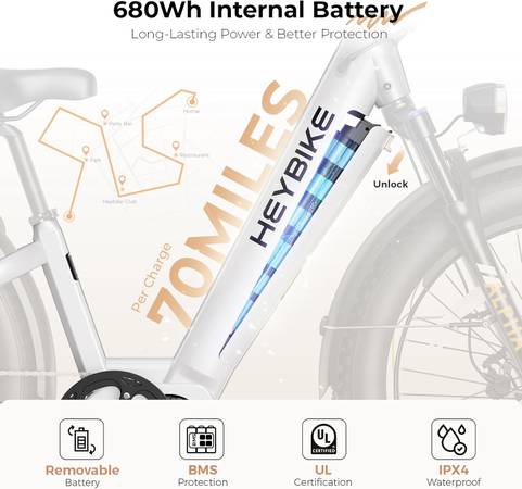 【Long-Lasting Battery Power】Ride up to 70 miles on a single charge with the 680Wh removable lithium battery—perfect for daily commutes or weekend adventures. The battery’s lockable design allows safe, convenient charging at home, work, or on the go.