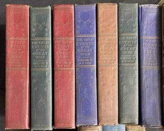 The Great Events of The Great War, Charles F. Horne, Editor in Chief & Walter F. Austin, Directing Editor. Published by The National Alumni (printed by J.J. Little & Ives, New York, 1920-23). Multi-colored cloth, elaborate gilt decoration on spines and covers; some fading on spines.
