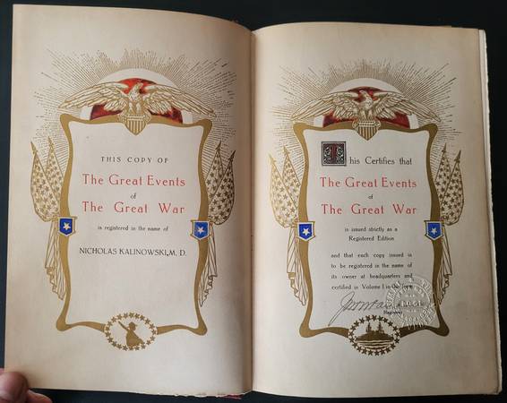 This set is part of the specially dedicated “registered edition”: Volume 1 is “registered in the name of Nicholas Kalinowski, M.D.” The volume (and others) also contains loose papers in Polish and English, indicating provenance/ownership.