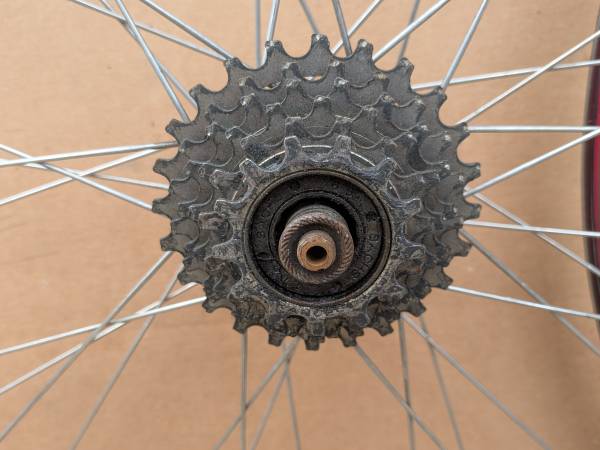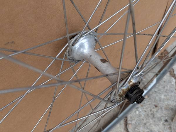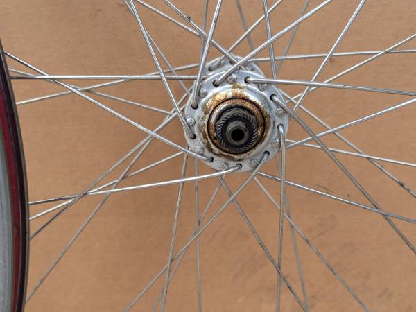 This is a nice set of Moscow rims on Campy Record hubs. The rims are round and true. Brake surfaces are fine. Minor marks from use. Hubs are smooth. 6-speed Sachs freewheel. Shipping available.