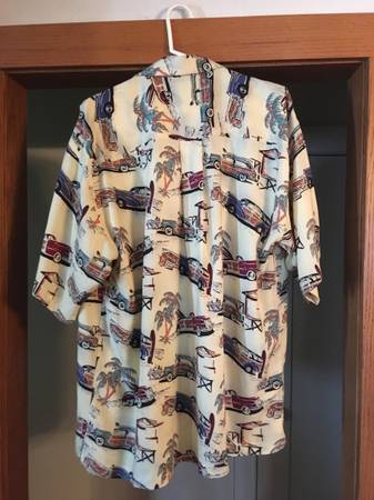 Used Mens XL M.E. Sport Vintage Hawaiian Shirt with Surf Boards, Woody Cars. and Palm Trees. light weight button down front with pocket. Washed pressed. Non smoker. Worn a few times, no holes, stored away. Short sleeve shirt. Sold as is no guarantee or warranty or refund. Ask any questions. Excellent condition.
