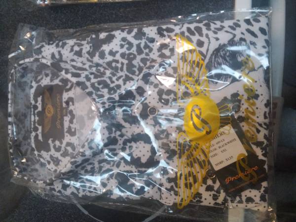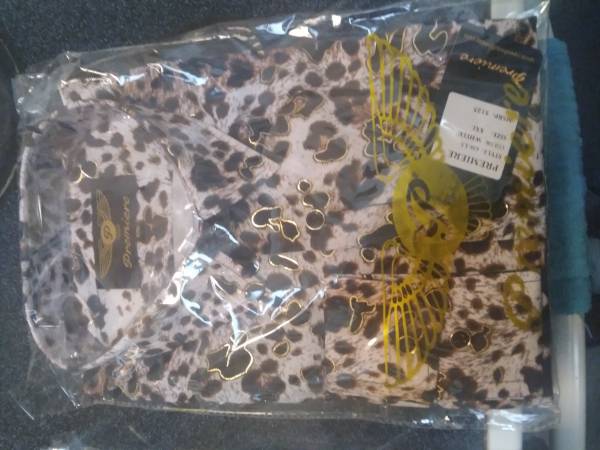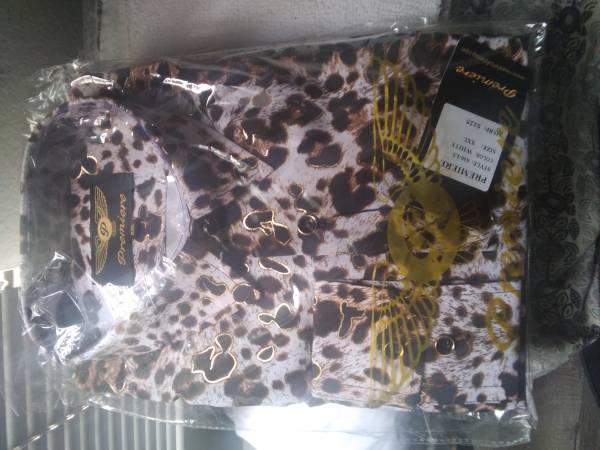 I have "TWO" leopard print button down collar shirts. Selling both at once. Still in its package with Tags. New never worn. 1- Black Leopard print on white shirt the other.... 2- Brown Leopard print...