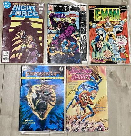 π± DETAILS: Lot of 5 vintage comic books: Night Force, Shield, E-Man, Figments, Amazing Heroes. Selling all five titles together for one price. Classic collectible comics for fans and collectors.
