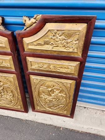 These are likely doors from an antique Chinese canopy bed, possibly dating back to the Ming Dynasty. The doors are made of wood, with a dark-stained frame and golden-colored, intricately carved panels. The carvings depict traditional Chinese motifs, such as mythical creatures and scenes from folklore. Based on the search results and image context, similar designs and craftsmanship were common in antique Chinese furniture, particularly canopy beds and wedding cabinets. The doors may have originally been part of a larger piece of furniture, such as a canopy bed or a cabinet, and could have been used for storage or as a decorative element.