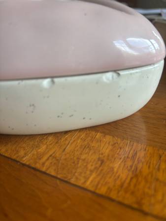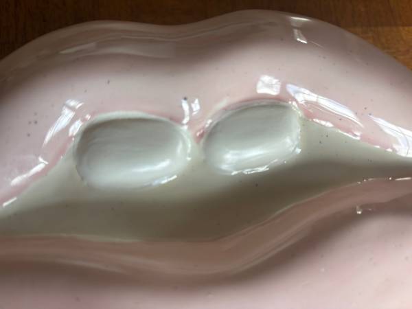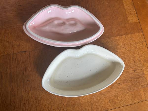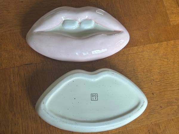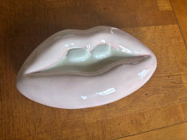 I am offering this really cute lidded dish that features pink lips and buck teeth. Every time I see this, I think of Amy Lou Wood and smile! There is a sheen to the glazing along with slight speckling to the ceramic, which adds interest!