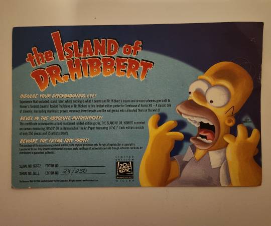 Purchased by me in 2004 at 20th Century Fox Studios gift shop. The Island of Dr. Hibbert Giclee on canvas is to commemorate The Simpsons TV show Treehouse of Horror halloween episode, The Island of Dr Hibbert is a segment of. It comes with a COA and is numbered 28/250. Color has not faded and is vibrant. Excellent condition overall. Measures approximately 20 x 30. Cash only. Local pickup only Hollywood/Los Angeles area.