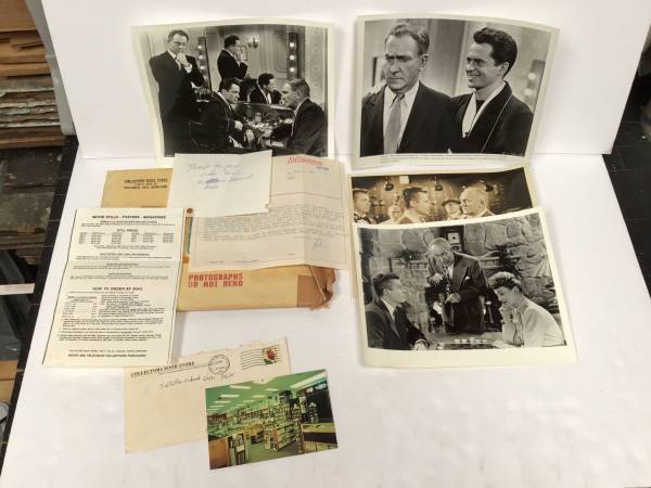 Handwritten note, typed correspondence (1991), price list & ordering instructions, photo postcard of store, and mailing envelopes