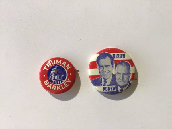 Vintage Presidential campaign pins - Truman/Barkley and Nixon/Agnew...