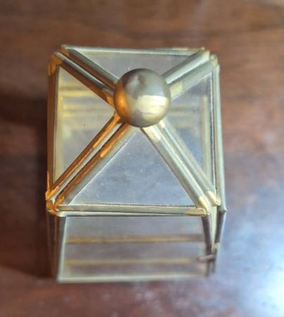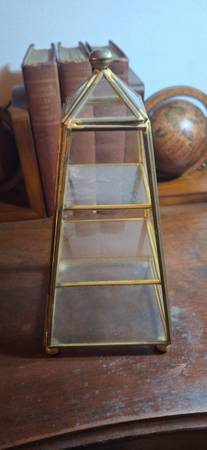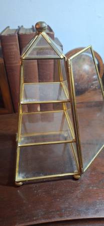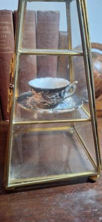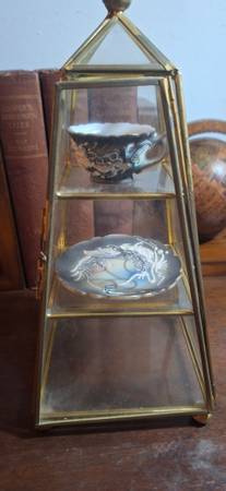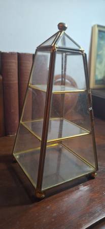Vintage 9" Pyramid glass display case, 4" base.. No broken glass, normal wear.. miniature plate and teacup not included