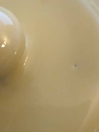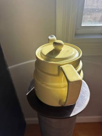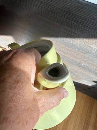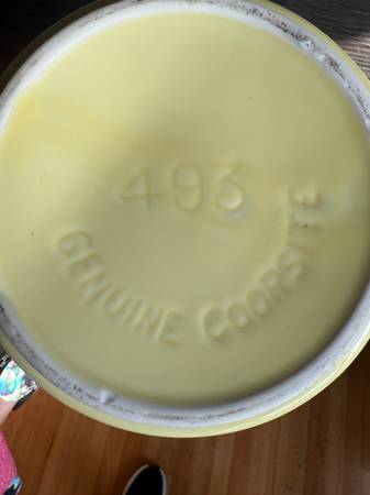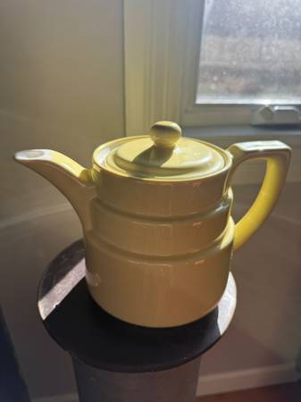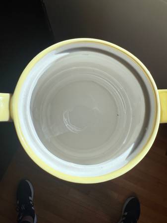 This piece is a lovely buttery yellow. It is a rare find and appears to have been on display only as it has no visible signs of wear. There is a pinpoint on the lid as per the manufacturing process as shown in the picture. It is a cheerful throwback to simpler times. This piece could work with Art Deco, Art Nouveau, Farmhouse, Seaside, Shabby Chic, Modern, and MCM decors.