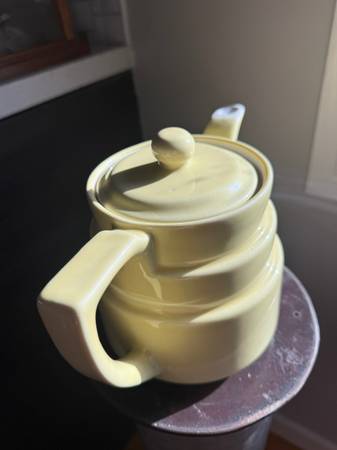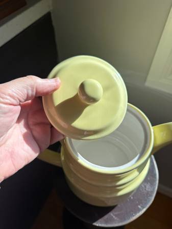 This is a large-capacity, heavy, ceramic coffee server/teapot by Coors Pottery. The base is marked 493 Genuine Coorsite. With lid, measures about 7-1/2" tall x 9-3/4" across spout to handle. Interior is flawless - no staining and may have never been used. There is one flea bite from he manufacturing as shown in the lid picture. It holds up to 48 ounces, 6 cups.