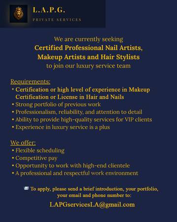 We are currently seeking freelance artists for our luxury service team, We are hiring certified or highly experienced Makeup Artists and certified or licensed Hair Stylists and Nail Technicians for the launch of LAPG (Legacy American Priority Group). LAPG is a premium service provider for elite clients seeking beauty services, private chefs and much more. You can view our upcoming website at lap18group.com.