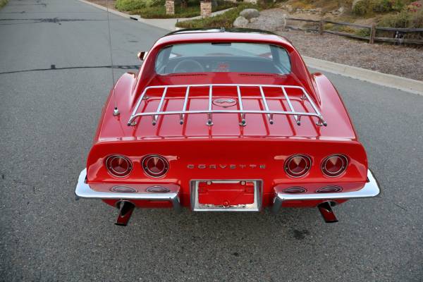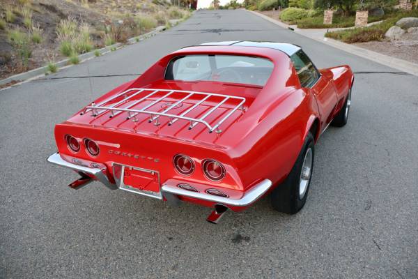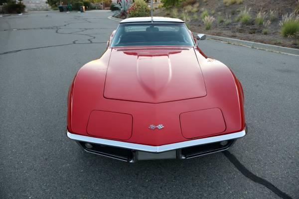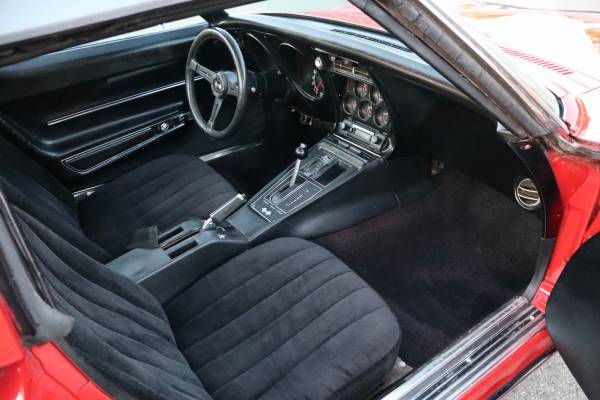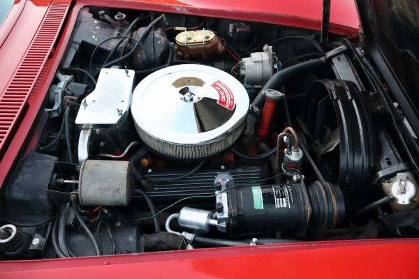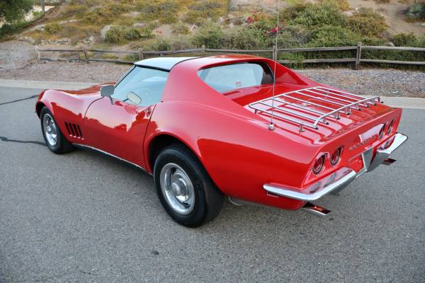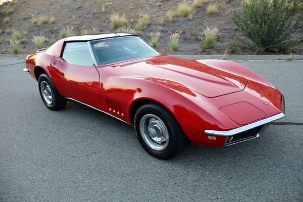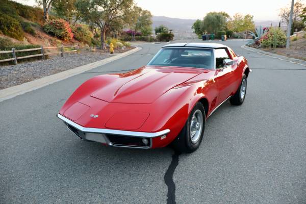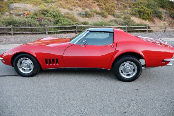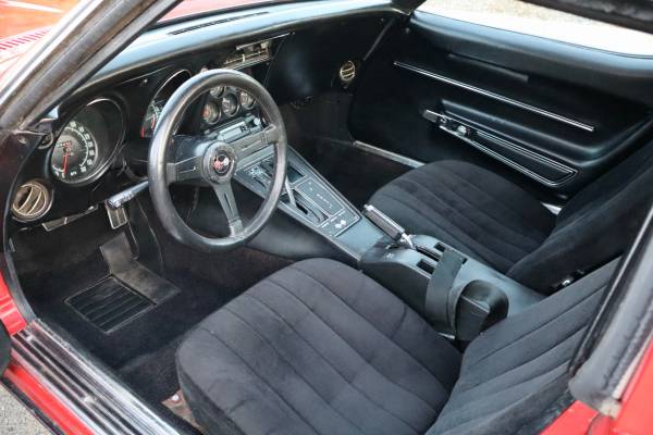 1968 Chevrolet Corvette. Comes with a small block V8 engine and an automatic three speed transmission. Equipped with power steering, power brakes and air conditioning. Four wheel disc brakes. This vehicle runs and drives. Still retains its chrome air cleaner and chrome distributor covers. The headlights have been converted from vacuum to electric. Wiper door and wipers are in working order. Glass T-Tops. Red exterior with a black interior.