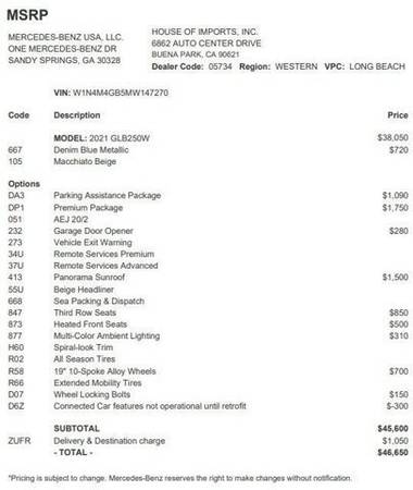 * Premium Package * Panorama Roof * Parking Assistance Package * 3rd Row Seat * Denim Blue Metallic * Wheels: 19" 10-Spoke W/Matte Black Accents (R58) * Panoramic Roof * Keyless-Go * Heated Front Seats * 3rd Row Seat * 64-Color Interior Ambient Lighting * Garage Door Opener * Wheel Locks * Keyless Start * Rear Spoiler * Beige Headliner * Macchiato Beige; Mb-Tex Upholstery * Spiral Look TrimThis vehicle includes a Money-Back Guarantee* and passed our precise inspection process. Best of all the price you see is the price you pay. No haggling. No back and forth. No pressure. And this price is so good it is guaranteed. *Money-Back Guarantee is valid for 5 days or 250 miles, whichever comes first. Subject to certain terms and conditions. See store for details. Some restrictions apply.On almost any road condition, this Mercedes-Benz GLB GLB 250 offers solid performance, reliability, and comfort. When it comes to high fuel economy, plenty of versatility and a great looks, this Mercedes-BenzGLB GLB 250 cannot be beat. This Mercedes-Benz GLB's superior fuel-efficiency is proof that not all vehicles are created equal. Driven by many, but adored by more, the Mercedes-Benz GLB GLB 250 is a perfect addition to any home. You could keep looking, but why? You've found the perfect vehicle right here.