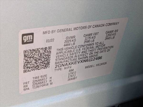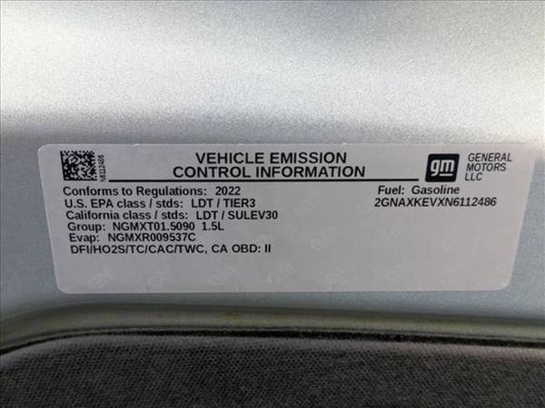 * Cargo Shade; Retractable And Stowable Under Load Floor * Lane Keeping Assist * Keyless Start * License Plate Front Mounting Package * Audio System; Chevrolet Infotainment 3 System; 7" Diagonal Color Touchscreen; AM/FM Stereo. * Axle; 3.50 Final Drive Ratio * Emissions; California State Requirements * Engine; 1.5L Turbo Dohc 4-Cylinder; Sidi; Vvt * Lt Preferred Equipment Group * Medium Ash Gray; Premium Cloth Seat Trim * Seaglass Blue Metallic * Seats; Front Bucket * Tires; P225/65R17 All-Season Blackwall * Transmission; 6-Speed Automatic; Electronically-Controlled With Overdrive * Wheels; 17" (43.2 Cm) AluminumThis vehicle includes a Money-Back Guarantee* and passed our precise inspection process. Best of all the price you see is the price you pay. No haggling. No back and forth. No pressure. And this price is so good it is guaranteed. *Money-Back Guarantee is valid for 5 days or 250 miles, whichever comes first. Subject to certain terms and conditions. See store for details. Some restrictions apply.This 2022 Chevrolet Equinox LT is offered to you for sale by We'll Buy Your Car Riverside. This Chevrolet includes: ENGINE, 1.5L TURBO DOHC 4-CYLINDER, SIDI, VVT4 Cylinder Engine Gasoline Fuel Turbocharged *Note - For third party subscriptions or services, please contact the dealer for more information.*This SUV gives you versatility, style and comfort all in one vehicle. Save money at the pump with this fuel-sipping Chevrolet Equinox.Just what you've been looking for. With quality in mind, this vehicle is the perfect addition to take home.