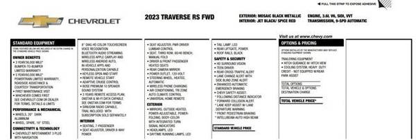 * Trailering Equipment * Leather Seats * Navigation System * 3rd Row Seat * Lane Keeping Assist * Keyless Start * License Plate Front Mounting Package * Audio System; Chevrolet Infotainment 3 Plus System * Cooling System; Heavy-Duty * Emissions; California State Requirements * Engine; 3.6L V6; Sidi; Vvt * Hitch Guidance With Hitch View * Hitch Guidance; Trailering Assist Guideline * Jet Black/Spice Red; Perforated Leather-Appointed Seat Trim * Mosaic Black Metallic * Rs Preferred Equipment Group * Seats; Front Bucket * Transmission; 9-Speed Automatic * Not Equipped With Rear Park Assist; See Dealer For Details.This vehicle includes a Money-Back Guarantee* and passed our precise inspection process. Best of all the price you see is the price you pay. No haggling. No back and forth. No pressure. And this price is so good it is guaranteed. *Money-Back Guarantee is valid for 5 days or 250 miles, whichever comes first. Subject to certain terms and conditions. See store for details. Some restrictions apply.
