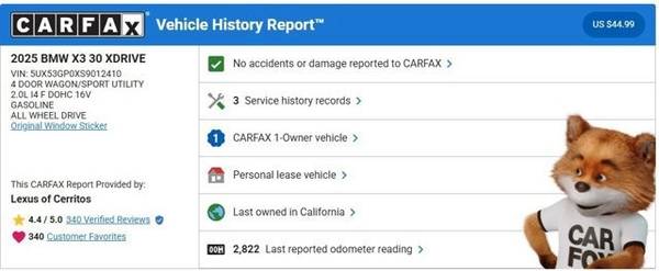 * Convenience Package * Panoramic Roof * Skyscraper Gray Metallic * Navigation System * Heated Steering Wheel * Keyless Start * Rear Spoiler * Black; Veganza Perforated & Quilted Upholstery * Individual Magnolia Fine Print Wood Trim * Wheels: 19" X 8.5" Aero Midnight Grey BicolorThis vehicle includes a Money-Back Guarantee* and passed our precise inspection process. Best of all the price you see is the price you pay. No haggling. No back and forth. No pressure. And this price is so good it is guaranteed. *Money-Back Guarantee is valid for 5 days or 250 miles, whichever comes first. Subject to certain terms and conditions. See store for details. Some restrictions apply.This outstanding example of a 2025 BMW X3 30 xDrive is offered by BMW of Carlsbad. This BMW includes: WHEELS: 19" CONVENIENCE PACKAGE Remote Engine Start Panoramic Roof Heated Steering Wheel Generic Sun/Moonroof Sun/Moonroof *Note - For third party subscriptions or services, please contact the dealer for more information.* In their original incarnation, SUVs were chiefly owned by folks who valued "utility" above "sport." Not anymore! The BMW X3 30 xDrive redefines the SUV and makes the perfect "all around" family companion. Opulent refinements married with exceptional engineering make this the kind of car you'll want to own for a lifetime. You could spend more on fuel each month than on your vehicle payments, so why not consider one with exceptional fuel economy like this 2025 BMW X3. Comfort. Performance. Safety. Enjoy all three with this well-appointed AWD 2025 BMW. The BMW X3 30 xDrive has a navigation system installed, so you'll always know where you're going. This top-tier navigation system is reliable and will get you to your destination quickly and by the most efficient route available.