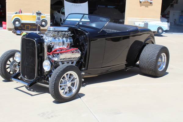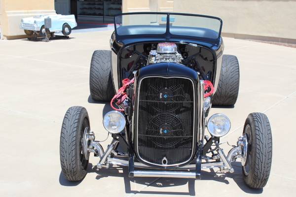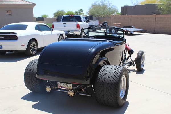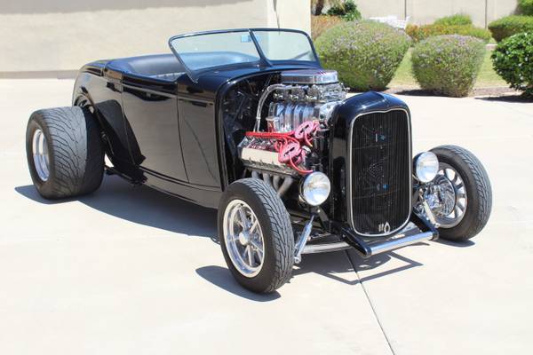 1932 ford roadster i have 3 available read the add,the only one built goes by the name ,just reduced $5000 TOP GUN,im sure a $100,000 build,i have the magazine street rodder that it was in with all specs.very low use,the previous owner passed away 4 years ago and the wife just cut it loose to me,here is the info on the build,first off its a wescott body one of the finest for sale,the black has been sanded and polished to near perfection,the interior is done by ron mangus,google him to see his work,im sure it was $10,000, it has a alpine sterio with amps and a cd stacker in the trunk,it has center line custom wheels 15x5 and 15x14 with hooser 18 in tires,every part in engine bay is polished,the under carriage is all chrome including the 9 inch ford rear end,the frame was made by the (duce factory),all the fromt end is chrome,front super bell disc brakes,with chrome rear drum brakes,it has a 525 keith black all aluminum hemi that produced 1000 horse power,was reported by the seller it was in don druomes dragster,it has a 871 magnuson ed pink blower, do not have documents to prove except the text to me from the seller and ed pink embossed blower,with 3 elebrock carbs try to find one i cant,i have that,this would be a great buy if you want a hemi in your mopar,the engine was $25000 the blower was $20000 thats $45000 just for the engine,the 400 turbo is a tci $6000 thats $51000 for motor and transmission,the chrome 9 in was $2000,the car is magnificant a real show car that will run in thr high 8 or low 9s in the 1/4 mile,the body is arrow straight,the hemi has all the right stuff,even a dual distributor,for the best timing and spark,the whole front end is chrome with polished backing plates,the blower is amazing,the stance is awsome,when was the last time you saw a keith black engine in a street rod,im sure this is a $200,000 build,i have it priced at $55000 try to find a build like this for that price,most of the 32 fords start at $55,000 and up,the horn is not working and no ac,just a awsome ride i think this is a $65000 to $75000 car,i have it priced at $50000 or trade,i also have a 1932 roadster built by boyd coddington and chip foose,$50000 the best,i also have another 32 roadster $39995 see 75 photos at www.classicsportsandtrucks.net.please calls only to many scammers out there,no texts or emails till we talk first,my phone is on from 7am to 6 pm arizona time after that it goes to voice mail call and leave me a number and i will call back,im a dealer collector in phoenix arizona,i have been in business for 58 years so buy with confidence,i buy,sell,trade,offer inspections and shipping,i have street rods,muscle cars,tesla,corvettes bentley,jeeps,challenger,49-55 pro tour pick ups,tr7,pontiac,trucks,trailers and more see 50-100 photos of all at www.classicsportsandtrucks.net 602-820-7395