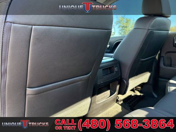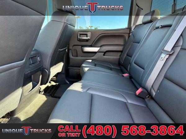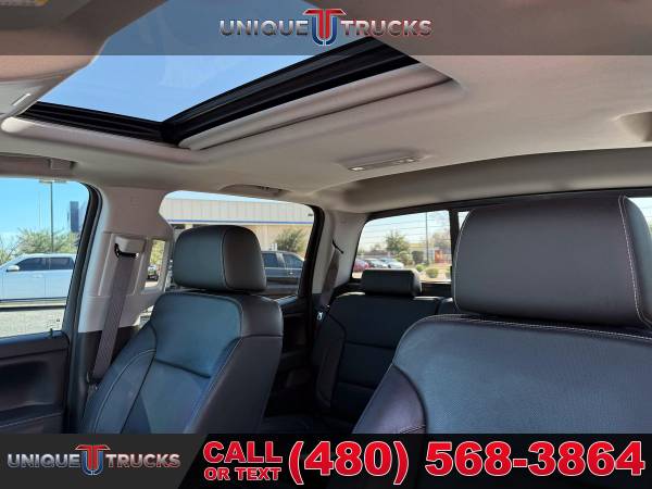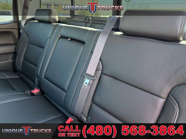 INSTALLED FEATURES: Air filtration, Front air conditioning: automatic climate control, Front air conditioning zones: dual, Airbag deactivation: occupant sensing passenger, Front airbags: dual, Side airbags: front, Side curtain airbags: front / rear, Antenna type: diversity / mast, Auxiliary audio input: Bluetooth / iPod/iPhone / jack / memory card slot / USB, In-Dash CD: MP3 Playback / single disc, Radio: AM/FM / HD radio / touch screen display / voice operated, Radio data system, Satellite radio: SiriusXM, Speed sensitive volume control, Total speakers: 6, ABS: 4-wheel, Braking assist, Electronic brakeforce distribution, Front brake type: ventilated disc, Power brakes, Rear brake type: ventilated disc, Armrests: front center / rear center with cupholders, Floor mat material: rubber/vinyl, Floor material: carpet, Floor mats: front / rear, Steering wheel trim: leather, Assist handle: front / rear, Capless fuel filler system, Cruise control, Cupholders: front / rear, Memorized settings: 2 driver / driver seat / side mirrors, Multi-function remote: keyless entry / panic alarm, One-touch windows: 4, Power outlet(s): 115V front / 12V front, Power steering, Power windows: lockout button, Reading lights: front, Rearview mirror: auto-dimming, Remote engine start, Steering wheel: tilt and telescopic, Steering wheel mounted controls: audio / cruise control / multi-function, Storage: door pockets / front seatback, Universal remote transmitter: garage door opener, Vanity mirrors: dual illuminating, Active grille shutters, Body side moldings: chrome, Bumper detail: rear step, Door handle color: chrome, Exhaust tip color: stainless steel, Front bumper color: chrome, Grille color: black surround / black with chrome accents / chrome surround, Mirror color: chrome, Pickup bed light, Rear bumper color: chrome, Tailgate: lift assist / power locking / removable, Window trim: chrome, Infotainment: MyLink, Infotainment screen size: 8 in., Clock, Digital odometer, External temperature display, Fuel economy display: MPG / range, Gauge: oil pressure / tachometer, Instrument cluster screen size: 4.2 in., Multi-function display, Trip odometer, Warnings and reminders: coolant temperature warning / lamp failure / low battery / low fuel level / low oil pressure / maintenance due, Daytime running lights: LED, Exterior entry lights: approach lamps / puddle lamps, Front fog lights: LED, Headlights: auto delay off / auto on/off / LED, Taillights: LED, Side mirror adjustments: power / power folding, Side mirrors: driver side auto-dimming / heated / integrated turn signals, 4WD selector: electronic hi-lo, 4WD type: part time w/ on demand setting, Alternator: 150 amps, Auxiliary oil cooler, Auxiliary transmission fluid cooler, Battery: heavy duty / maintenance-free, Battery rating: 720 CCA, Battery saver, Cylinder deactivation, Locking differential: rear, Camera system: rearview, Check rear seat reminder, Child safety door locks, Child seat anchors: LATCH system, Programmable safety key, Rearview monitor: in dash, Emergency locking retractors: front, Front seatbelts: 3-point, Rear seatbelts: 3-point, Seatbelt pretensioners: front, Seatbelt warning sensor: front, Driver seat: heated, Driver seat power adjustments: 10 / height / lumbar / reclining, Front headrests: 2 / adjustable, Front seat type: 40-20-40 split bench, Passenger seat: heated, Passenger seat power adjustments: 10 / height / lumbar / reclining, Rear headrests: 2 / adjustable, Rear seat folding: folds up, Rear seat type: 60-40 split bench, Upholstery: leather-trimmed, Anti-theft system: alarm / vehicle immobilizer, Power door locks: anti-lockout / auto-locking, Hill holder control, Roll stability control, Stability control, Traction control, Trailer stability control, Front shock type: twin-tube gas, Front spring type: coil, Front stabilizer bar: diameter 34 mm, Front struts, Front suspension classification: independent, Front suspension type: upper and lower control arms, Rear shock type: twin-tube gas, Rear spring type: leaf, Rear suspension classification: solid live axle, Rear suspension type: multi-leaf, Electronic messaging assistance: with read function, Hands-free phone call integration: voice operated, Satellite communications: OnStar, Wi-Fi: hotspot, Wireless data link: Bluetooth, Tow hooks: front, Tow/Haul mode, Trailer hitch, Trailer wiring: 4-pin / 7-pin, Spare tire mount location: underbody, Spare tire size: full-size, Spare wheel type: steel, Tire Pressure Monitoring System, Wheels: aluminum alloy, Front wipers: variable intermittent, Pickup sliding rear window: power horizontal, Power windows: safety reverse, Tinted glass, Window defogger: rear