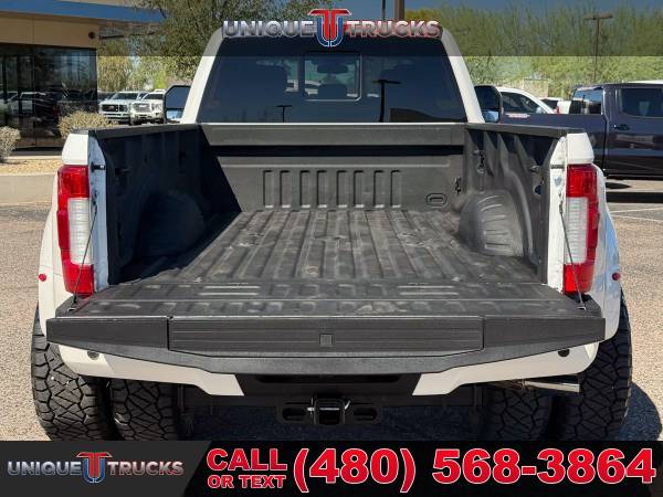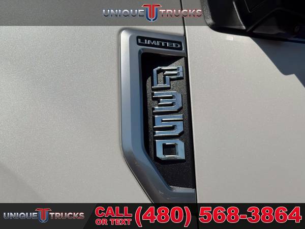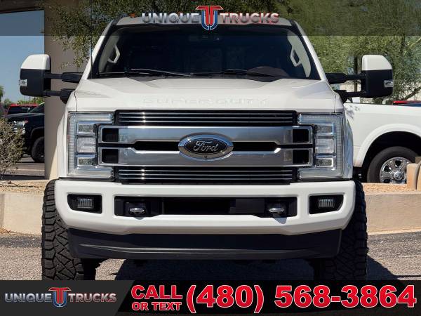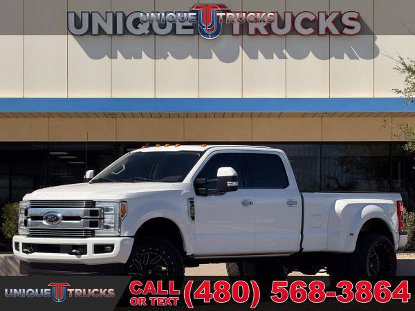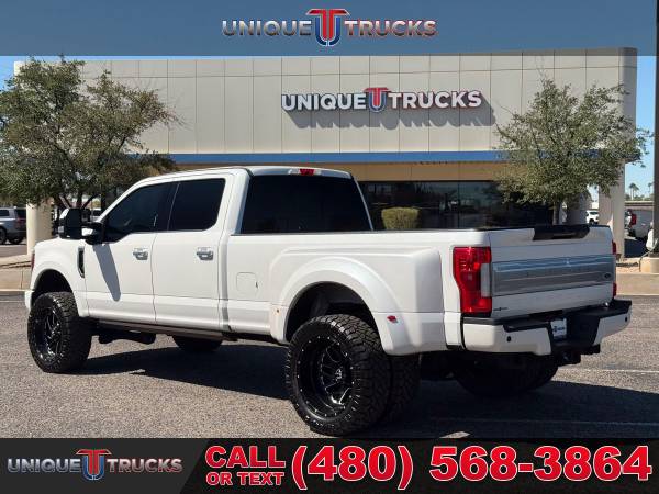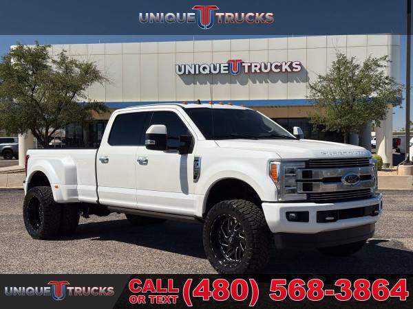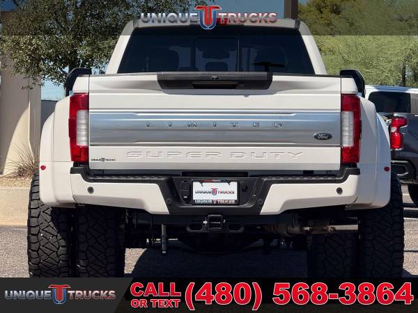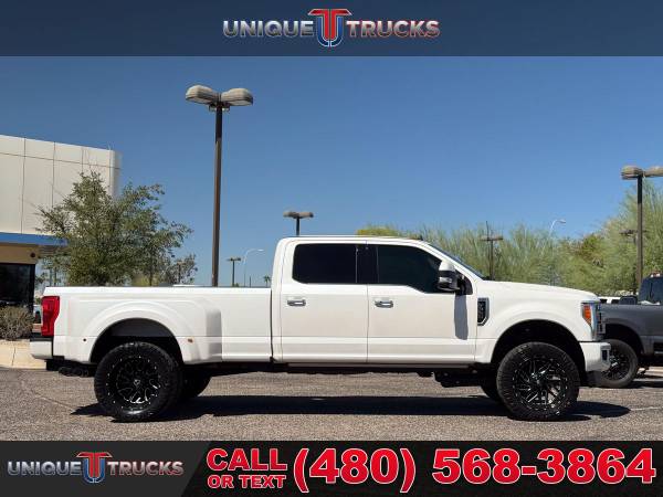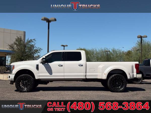 This lifted and hard to find 2019 Ford F-350 Super Duty Limited Edition 4x4 Dually Crew Cab is one of the cleanest and nicest trucks you will find anywhere. Finished in the White Platinum Tri Coat exterior with chrome accents and color key matching front and rear bumpers, this truck stands out as an eye catching guaranteed head turner. The wide stance of the dually combined with the lift and upgraded wheels gives it a look that turns heads everywhere it goes.Step inside and you are welcomed by the Limited Edition cocoa leather interior with Limited badging stitched throughout. The soft leather seating with heated and cooled front seats and heated rear seats makes every ride comfortable. Illuminated scuff plates, ambient lighting, and a leather wrapped tilt and telescoping steering wheel with memory pedals complete the premium interior. The 10–way power seats and dual zone climate control give both driver and passengers comfort on every trip.Under the hood, this F-350 Limited carries the 6.7 liter Power Stroke V8 turbocharged diesel engine matched with the smooth shifting 6-speed automatic transmission. With the 3.55 limited slip axle and 14,000 pound GVWR package, this truck is built for hauling and towing heavy loads. Dual extra heavy duty alternators, 5th wheel hitch prep package, and trailer brake controller make this lifted dually ready to pull with ease. This truck is not only powerful but dependable for work or play.The lift comes from a 3.5-inch Ready Lift suspension that gives this dually the height and aggressive stance you’re looking for. Fuel wheels wrapped in all terrain tires set the tone, giving this lifted truck both looks and capability. Whether parked in front of the job site or pulling into town, this lifted dually makes a statement. It is clean, sharp, and built to handle any task while looking like a showpiece.Exterior features include LED headlamps, LED tail lights, power moonroof, power deploy running boards, and Powerscope telescoping trailer tow mirrors. It also comes with rain sensing wipers, tow hooks, high mount center stop lamp, remote tailgate release with lift assist, and a locking removable tailgate. With chrome trim and Limited badging, this lifted truck carries a premium look from every angle.Inside, technology is everywhere. This truck comes with SYNC 3, voice activated navigation, reverse camera system, reverse sensing system, and FordPass Connect. It also includes adaptive steering, adaptive cruise control with collision warning, intelligent access, remote vehicle start, and MyKey. Upfitter switches give extra options for accessories, and the premium audio keeps the sound clear throughout the cabin.Safety is always key, and this Limited comes with airbags for driver and passenger, child seat tethers, lane keeping alert, passive anti theft system, safety belts with adjustable fit, and SOS post crash alert system. BLIS with cross traffic alert and trailer tow features make backing up and lane changes simple. This truck is built to give peace of mind while on the road or at work.Extra details like the all weather floor mats, PTC supplemental heater, 50 state emissions, jack, and polished chrome accents show that this truck was built with care from front to back. With the 5th wheel prep package, this truck is fully ready to tow with no extra work needed. Every detail comes together to make this lifted dually one of the cleanest lifted trucks available today.At Unique Trucks, the price you see is the price you pay. There are no hidden markups, no addendums, and no surprises. We keep things simple and upfront. When you shop lifted trucks with us, you know you’re getting a fair and honest deal on one of the cleanest trucks around.We also make buying easy with our no obligation delivery service. This lifted 2019 Ford F-350 Limited Dually can be delivered right to your doorstep with no obligation at all. You can test drive it from the comfort of your own home, make your best deal over the phone, and if you don’t like it you don’t buy it. We love trade ins and always encourage you to visit and check out our full selection of lifted trucks and trucks of all kinds. This clean lifted dually is fully serviced, ready to go, and ready for its next owner today.