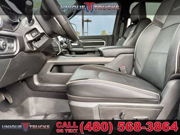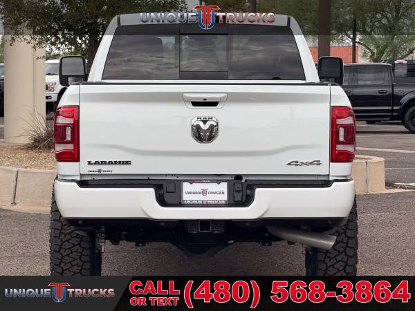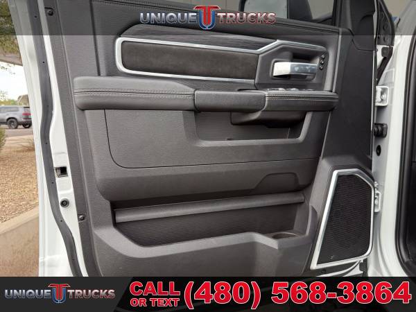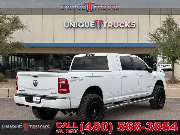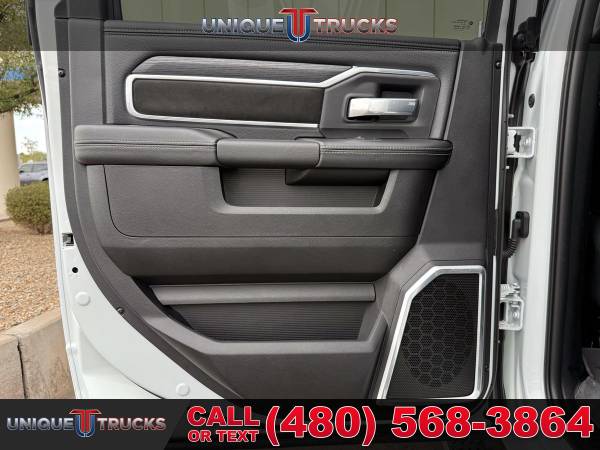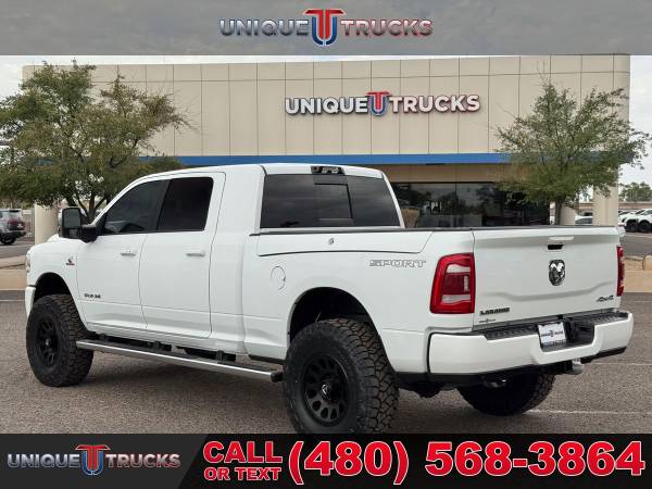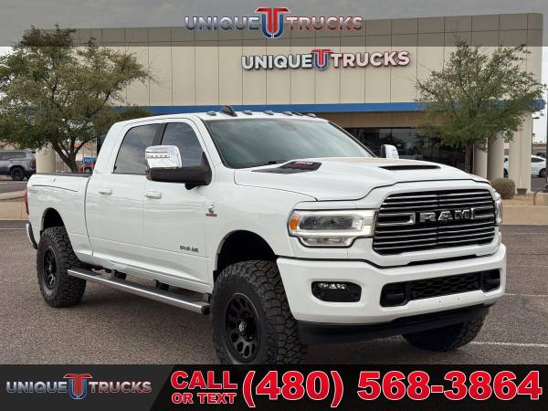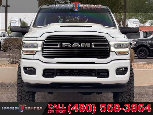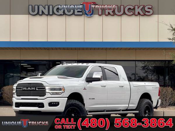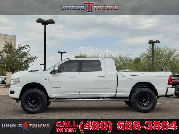 Here is one of the cleanest lifted trucks you will find, a 2024 Ram 2500 Laramie Mega Cab Sport 4x4 in Bright White Clear Coat with color-matched trim and a black leather interior. The look is bold, clean, and ready to turn heads anywhere it goes.This Ram has been upgraded with a brand new professionally installed 2.5-inch RCX level kit. Sitting on 37x12.50x18LT Toyo Open Country R/T Trail tires, this lifted truck has the right stance, grip, and style. The sport performance hood and blacked-out accents only add to its powerful presence on the road.Under the hood, the proven 6.7L I6 Cummins Turbo Diesel engine delivers strength you can count on every day. Paired with the smooth 6-speed automatic transmission, it offers serious pulling power along with dependable performance for long hauls, towing, or daily use.Inside, the black leather-trimmed bucket seats bring both comfort and style. Heated and ventilated front seats, a large Mega Cab interior, and memory settings for the driver make it perfect for long drives. The Laramie trim blends luxury with work-ready durability.The tech inside this truck makes it easy to stay connected. The Uconnect® 5 Nav system with a massive 12-inch touchscreen display puts everything within reach. You also get SiriusXM® 360L, Apple CarPlay®, Android Auto™, and a full-function media hub with USB and aux ports. The 9 Alpine® speakers with subwoofer deliver clear, rich sound that fills the cab.For safety and convenience, this Ram comes with ParkSense® front and rear park assist, blind-spot monitoring with trailer detection, cross-path detection, surround-view camera system, and trailer reverse guidance. These features give you confidence whether you’re parking in tight spaces or backing up with a trailer.The Bed Utility Group adds practical touches like LED bed lighting, deployable Mopar® bed step, spray-in bedliner, and adjustable tie-down hooks. A RamBox® cargo management system and cargo divider make hauling tools and gear simple and secure. Forward and reverse utility lights keep everything visible even at night.Details like rain-sensitive wipers, remote tailgate release, power sliding rear window, automatic power-folding mirrors, and power-adjustable pedals with memory make daily driving easier. Clearance lamps, LED reflector headlights, and LED fog lamps add both style and function.This lifted Ram is fully serviced and ready for its next owner. With the anti-spin differential rear axle, tow hooks, 220-amp alternator, transfer case skid plate, and tow technology group, this truck is built to handle work, play, and everything in between.At Unique Trucks, we make buying simple with our No Obligation Delivery Service. We’ll bring this lifted truck right to your doorstep for a test drive from home. Make your best deal over the phone, and if you don’t love it, you don’t buy it. We also love trade-ins and encourage you to come see our wide selection of trucks and lifted trucks in person today.