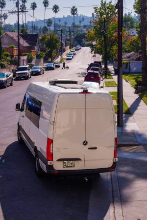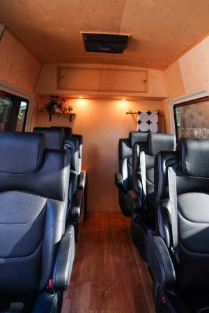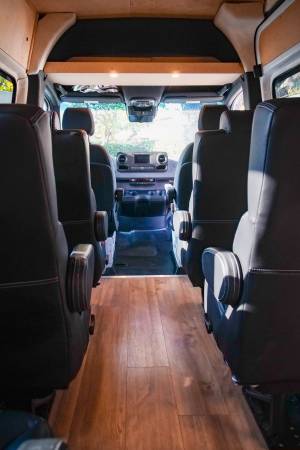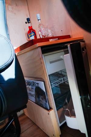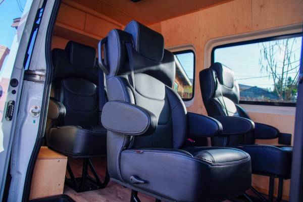 Over $100k spent on the van. Dometic air conditioning unit installed in the passenger area. The interior was built out using high quality baltic birch. DOT approved captains chairs are thoughtfully placed to ensure that everyone's seat has the same amount of legroom. Seats are also easily removed and can be rotated / rearranged. Mass-loaded-vinyl added throughout to make the van quieter on the highway. Dometic fridge powered by a solar panel so your food is safe even when the van isn't running. Cell phone chargers for every seat. Suspension corrected to accommodate gear storage in the trunk. Truly one of the best possible touring vans!
