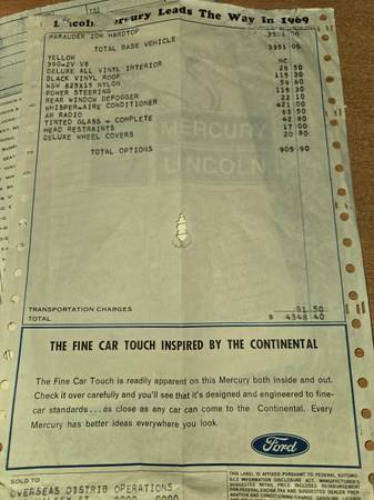 Very Rare (1 of 65 with Manual Transmission 1969 Mercury Marauder 390 V8 4 Bbl. 3 speed manual transmission 80k Miles. New clutch, nos rebuilt shifter. New gas shocks, rear springs. Recored original radiator, New hoses, rear brakes, new tires, battery, car recently fully serviced.Very clean and original. Car is very rare and was originally special ordered by an Air Force pilot. Lots of original paperwork telegrams to and from Ford about it having a manual transmission. Order form with financing Chase Bank Siagon,Vietnam and Marti report. Window sticker, warranty card, pre inspection form. Has to be the rarest 69 Marauder with this much original paperwork.