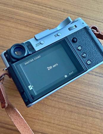 Basically brand new Fuji X100V in silver. Fuji UV filter, lens hood, thumbs up grip, extra battery and custom leather strap from Brooklyn. Shutter count is 200 (Technically 100) the shutter actuates...