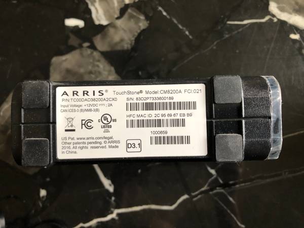 For sale is an Arris Touchstone CM8200A DOCSIS 3.1 Cable Modem. In great working condition. Comes with cable modem, power plug, ethernet cable, and coaxial cable.