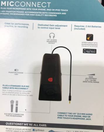 I have a: Griffin MicConnect Interface (XLR To Audio Jack)(Model: 35891) For Sale If interested, please text me at: If interested, please text me at: (three 2 three)802-4 nine 2 nine