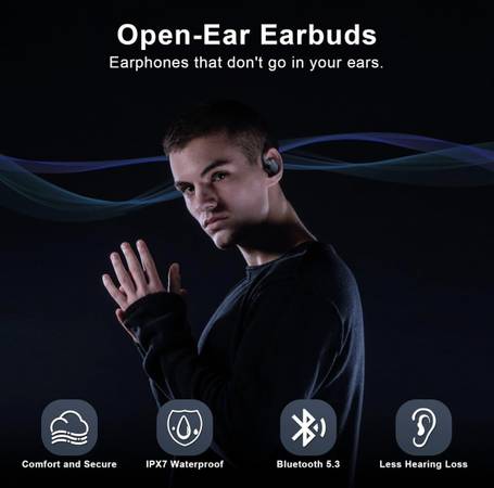 👉🏻Open Ear Design - The wireless bluetooth earbuds feature with open ear design. The earbuds do not go into your ears. No fear of ear fatigue and infections. Soft and flexible earhooks bring you ultimate ear comfort. You can stay aware of the surroundings when listening to music, more secure for your daily use.
