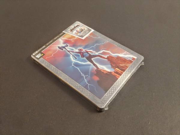 Thor: Love and Thunder Steelbook - factory sealed 4K UHD Blu-ray set that includes the movie along with bonus features such as a behind the scenes featurette. This edition showcases the superhero franchise with Chris Hemsworth starring as Thor. The steelbook case adds a unique touch to this must-have collectible for fans of Marvel, Disney, Avengers, and action movies in general. The 2022 release is region-free, making it accessible for viewers in various regions.