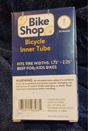 Product details Inner tubes are new in box. $6ea. Installation is available. Price depends on bike or scooter type Restore your ride to its original level of performance with this Bike Shop Bicycle Inner Tube. It's made of a high-quality material. This Schrader inner tube has cured rubber construction. The packaging includes complete instructions for easy assembly. Mold cured rubber for consistent side wall–prevents high pressure blow outs Schrader valve type Great for kid bike tires For 12" bikes