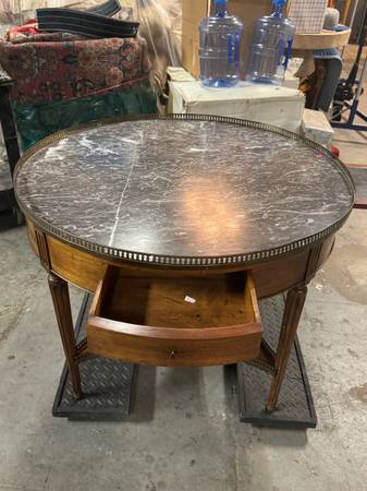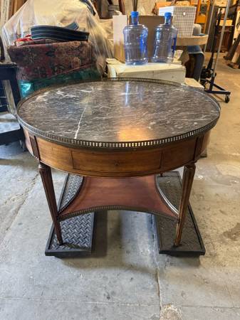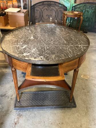 19th Century French Louis XVI Marble Top Walnut & Brass Bouillote Table 39” Round Gray marble round table with Wood Base and brass metal with 2 drawers and 2 pull out writing shelves 39”...