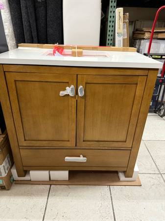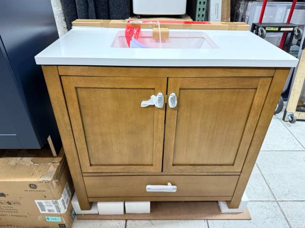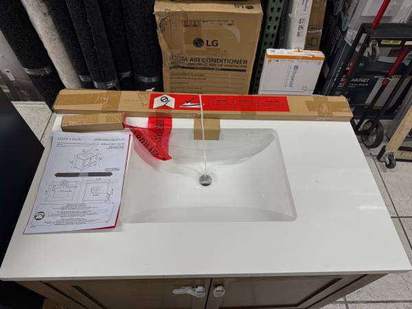 New - Undermount SINK IS BROKEN SEE PICTURES - sold-as-is MODEL: RONALD36W Brand: allen & roth Measurements: 36 in W x 37.75 in H x 22 in D 3 inch removable backslash Pre drilled for 8 inch wide...